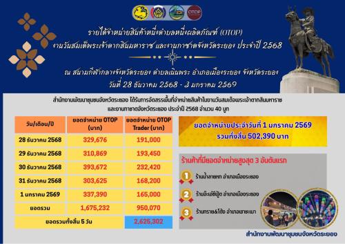 ⚜️โดยสำนักงานพัฒนาชุมชนจังหวัดระยอง ได้รับการจัดสรรพื้นที่จำหน่ายสินค้า OTOP ในงานฯ จำนวน 30 ร้านค้า โดยมียอดจำหน่ายวันที่ 1 มกราคม 2568 รวมทั้งสิ้น 337,390 บาท