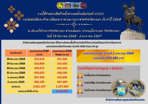 ⚜️โดยสำนักงานพัฒนาชุมชนจังหวัดระยอง ได้รับการจัดสรรพื้นที่จำหน่ายสินค้า OTOP ในงานฯ จำนวน 30 ร้านค้า โดยมียอดจำหน่ายวันที่ 2 มกราคม 2569 รวมทั้งสิ้น 386,195 บาท