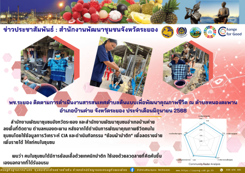 สำนักงานพัฒนาชุมชนจังหวัดระยอง ร่วมกับ สำนักงานพัฒนาชุมชนอำเภอบ้านค่าย จังหวัดระยอง ร่วมลงพื้นที่ติดตามกลุ่มอาชีพย้อมผ้าปาติก หลังจากได้รับการอบรมเพิ่มศักยภาพกลุ่มอาชีพย้อมผ้าปาติก ภายใต้โครงการสารสนเทศตำบลต้นแบบเพื่อการพัฒนาคุณภาพชีวิต ของตำบลหนองตะพาน อำเภอบ้านค่าย จังหวัดระยอง