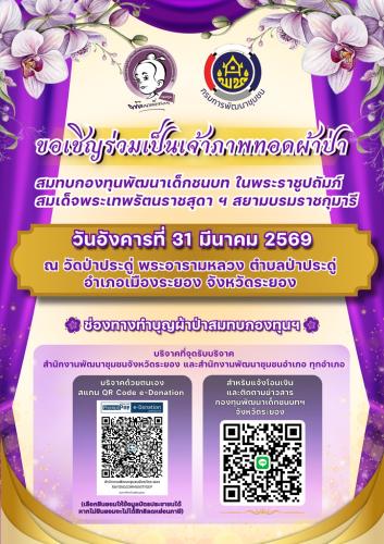 สพจ.ระยอง ขอเชิญชวนทุกท่านร่วมทอดผ้าป่าสมทบกองทุนพัฒนาเด็กชนบท ในพระราชูปถัมภ์สมเด็จพระเทพรัตนราชสุดาฯ สยามบรมราชกุมารี จังหวัดระยอง ประจำปี 2569